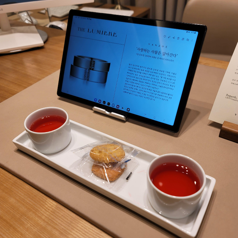 세상에.. 이렇게 맞이해 주신다고요?! 사진으로 많이 보긴 했지만 직접 마주하니 기분이 너무 좋아지더라고요. 많은 사람들이 보러 올 텐데 다 이렇게 정성 들여 맞이해 주신다니!! 여기서 1차 감동받았습니다.💖 우리 이름도 따로 적혀있고 차 한 잔과 맛있는 쿠키까지~! 당이 떨어지고 있었는데 충전 바로 되면서 프라이빗한 공간이 주는 분위기에 빠져들었습니다!ㅎㅎ