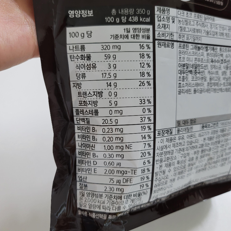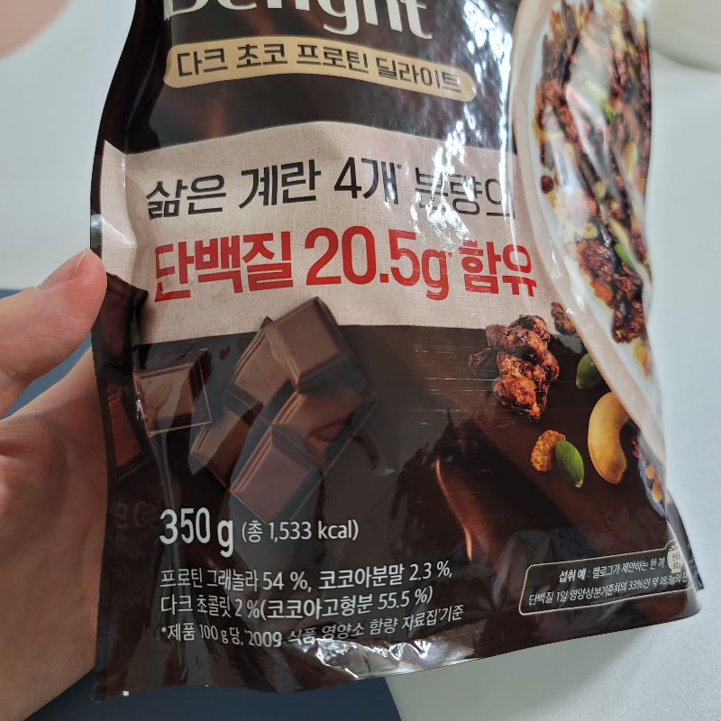 단백질 20.5g 함유!!ㅋㅋㅋ그럼 생각보다 텁텁한 맛이 나려나? 싶은 걱정도 되었지만 다크초콜릿도 들어가 있고 어느 정도 기본값으로 맛은 있겠다 싶어서 엄청 기대했습니다.