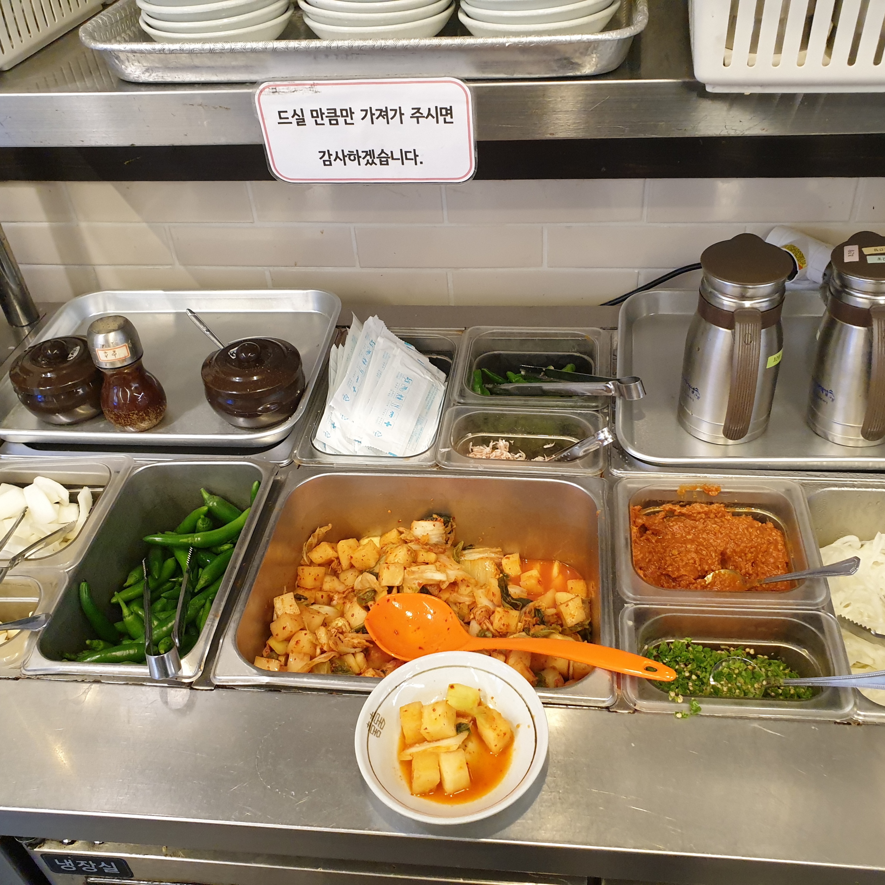 셀프바에는 양파, 마늘, 땡초, 깍두기 등등