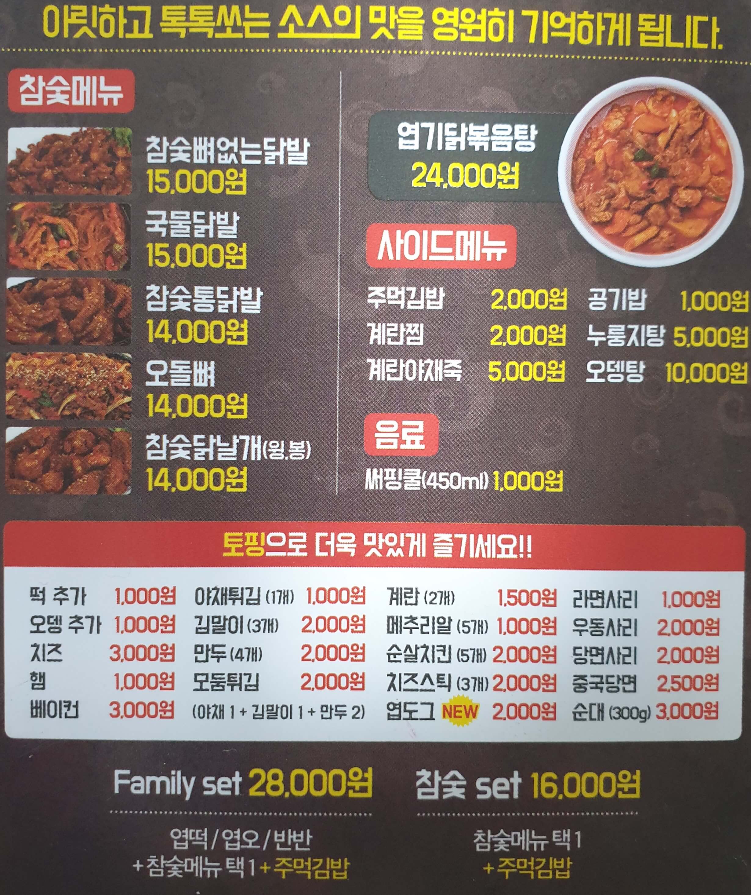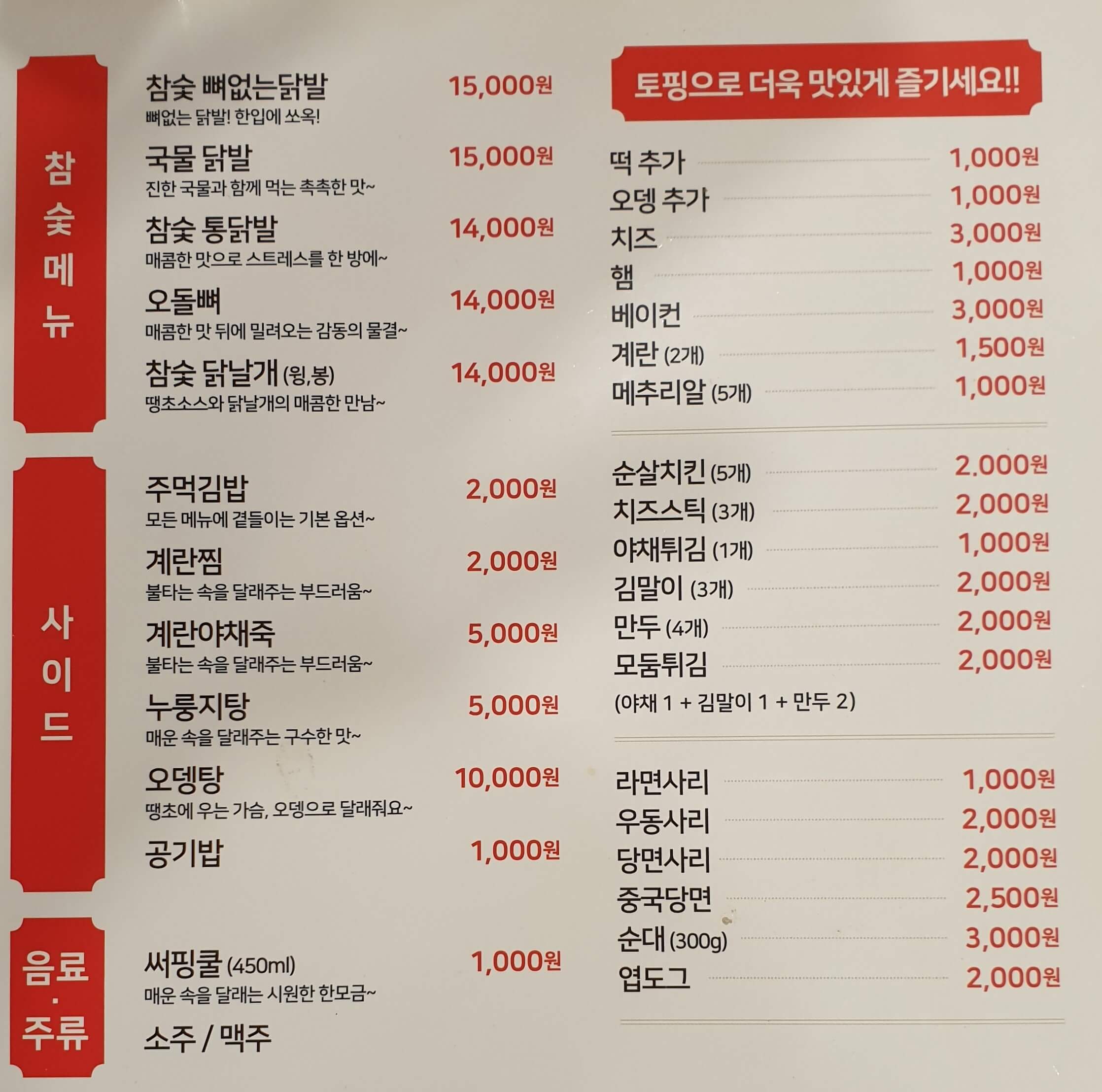 엽기 떡볶이에 닭발도 팔더라고요, 기회가 된다면 한 번 먹어보고 후기 남겨 드릴게요. 참숯 메뉴, 사이드, 음료, 토핑이 나와있어요. 토핑의 종류가 많이 있는데 취향에 따라 같이 주문하시면 더욱 맛있게 드실 수 있습니다.