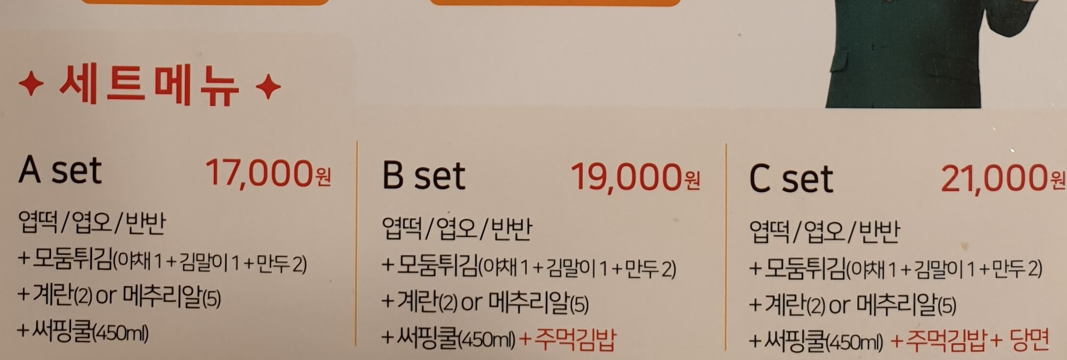 엽기 떡볶이 세트 메뉴로 드신다면 조금 할인된 가격으로 드실 수 있어요. 총 다섯 가지 세트 메뉴가 있습니다. A세트, B세트, C세트, 패밀리 세트, 참숯 세트 중 잘 읽어보시고 상황에 맞게 선택해서 드시면 될 것 같아요.